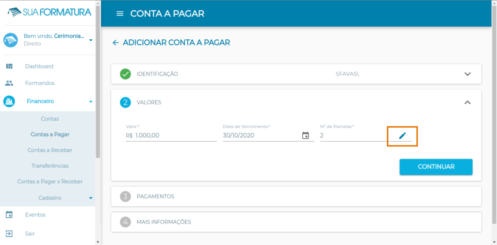 *É possível editar as parcelas de modo que o valor de cada uma delas será de acordo com sua preferência. Para isso, basta clicar no Lápis ao lado do número de parcelas, editar os valores e clicar em Aplicar.