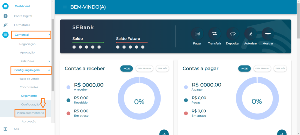 1. Para acessar os planos orçamentários, clique em Comercial, na aba esquerda do dashboard, em seguida Configuração Geral > Orçamento > Plano Orçamentário;