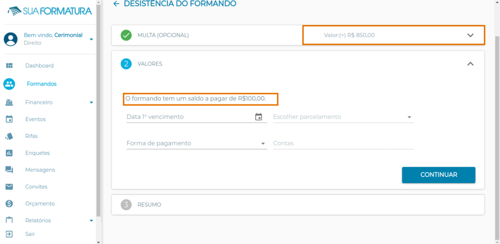 – Caso você escolha não aplicar multa no formando, o saldo pago por ele será considerado valor a receber (devolução para o formando).