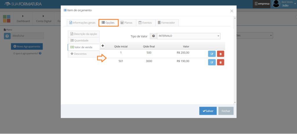 Ao selecionar tipo de valor livre, o vendedor ou responsável poderá colocar qualquer quantidade no momento da elaboração do orçamento.